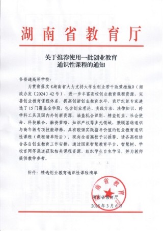 2025年3月6日,湖南省教育厅发布通知,推荐全省高校使用一批创业教育通识性课程,以进一步丰富高校创业教育课程资源,完善创业教育课程体系,提高创新创业教育水平。中南大学《知识产权法》在线课程成功入选,成为15门具有较强实践指导价值的创业教育通识性课程之一。